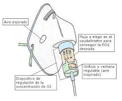 c. Mascarilla Venturi : Utiliza concentraciones fijas de oxígeno, independientemente del patrón respiratorio del paciente. Administraremos concentraciones de entre 24% al 50% a un flujo de 3 a 8 L/min. Este tipo de mascarilla nunca suministra distinta concentración de la prescrita.